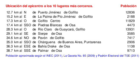 Mapa de la zona epicentral. Se muestran las poblaciones más cercanas al epicentro y fallas activas. Abajo están las distancias que hay del epicentro a cada uno de los diez sitios más cercanos y la cantidad de habitantes que poseen.