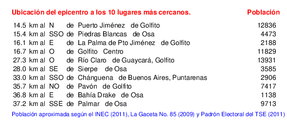 Mapa de la zona epicentral. Se muestran las poblaciones más cercanas al epicentro y fallas activas. Abajo están las distancias que hay del epicentro a cada uno de los diez sitios más cercanos y la cantidad de habitantes que poseen.