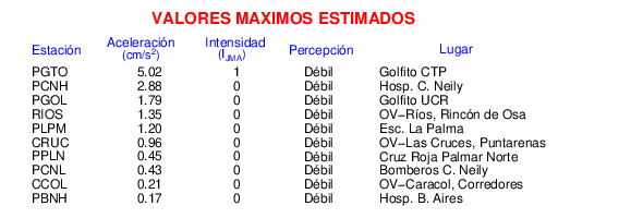 Intensidades en sitios de registro.Cada uno de los cuadrados en el mapa corresponde a la ubicación de un acelerógrafo al momento del sismo. Estos se muestran en distintos colores según la escala mostrada al pie de la figura.
