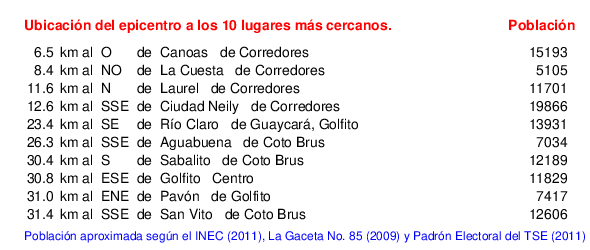 Mapa de la zona epicentral. Se muestran las poblaciones más cercanas al epicentro y fallas activas. Abajo están las distancias que hay del epicentro a cada uno de los diez sitios más cercanos y la cantidad de habitantes que poseen.