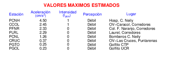 Intensidades en sitios de registro.Cada uno de los cuadrados en el mapa corresponde a la ubicación de un acelerógrafo al momento del sismo. Estos se muestran en distintos colores según la escala mostrada al pie de la figura.