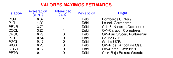 Intensidades en sitios de registro.Cada uno de los cuadrados en el mapa corresponde a la ubicación de un acelerógrafo al momento del sismo. Estos se muestran en distintos colores según la escala mostrada al pie de la figura.