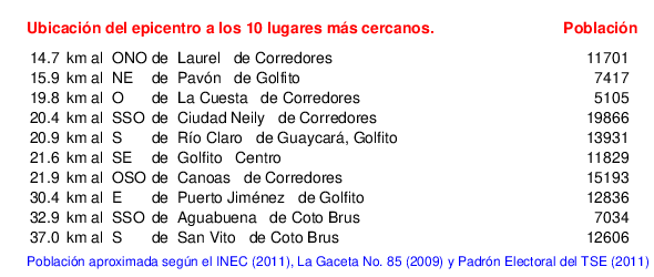 Mapa de la zona epicentral. Se muestran las poblaciones más cercanas al epicentro y fallas activas. Abajo están las distancias que hay del epicentro a cada uno de los diez sitios más cercanos y la cantidad de habitantes que poseen.