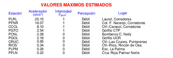 Intensidades en sitios de registro.Cada uno de los cuadrados en el mapa corresponde a la ubicación de un acelerógrafo al momento del sismo. Estos se muestran en distintos colores según la escala mostrada al pie de la figura.