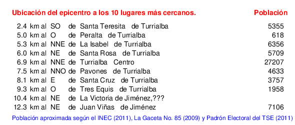 Mapa de la zona epicentral. Se muestran las poblaciones más cercanas al epicentro y fallas activas. Abajo están las distancias que hay del epicentro a cada uno de los diez sitios más cercanos y la cantidad de habitantes que poseen.