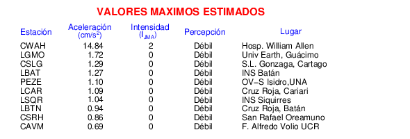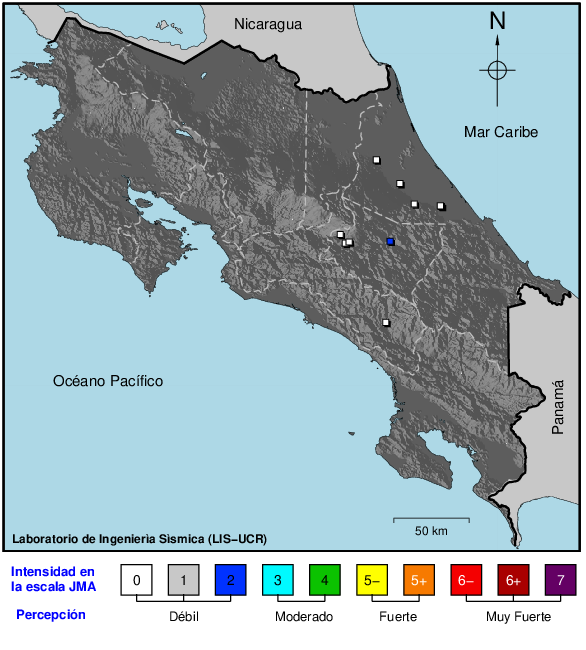 Intensidades en sitios de registro.Cada uno de los cuadrados en el mapa corresponde a la ubicación de un acelerógrafo al momento del sismo. Estos se muestran en distintos colores según la escala mostrada al pie de la figura.