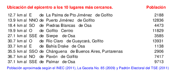 Mapa de la zona epicentral. Se muestran las poblaciones más cercanas al epicentro y fallas activas. Abajo están las distancias que hay del epicentro a cada uno de los diez sitios más cercanos y la cantidad de habitantes que poseen.
