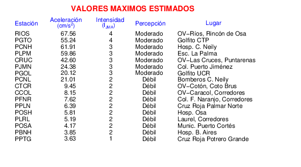 Intensidades en sitios de registro.Cada uno de los cuadrados en el mapa corresponde a la ubicación de un acelerógrafo al momento del sismo. Estos se muestran en distintos colores según la escala mostrada al pie de la figura.