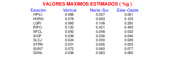 La siguiente tabla muestra los datos de aceleración máxima para cada componente en porcentaje de la aceleración de la gravedad (%g). Estos se obtienen dividiendo el valor del PGA registrado por 980 cm/s2 y multiplicándolo por 100.