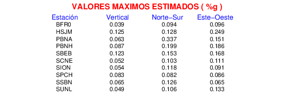 La siguiente tabla muestra los datos de aceleración máxima para cada componente en porcentaje de la aceleración de la gravedad (%g). Estos se obtienen dividiendo el valor del PGA registrado por 980 cm/s2 y multiplicándolo por 100.