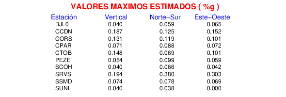La siguiente tabla muestra los datos de aceleración máxima para cada componente en porcentaje de la aceleración de la gravedad (%g). Estos se obtienen dividiendo el valor del PGA registrado por 980 cm/s2 y multiplicándolo por 100.