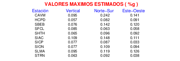 La siguiente tabla muestra los datos de aceleración máxima para cada componente en porcentaje de la aceleración de la gravedad (%g). Estos se obtienen dividiendo el valor del PGA registrado por 980 cm/s2 y multiplicándolo por 100.