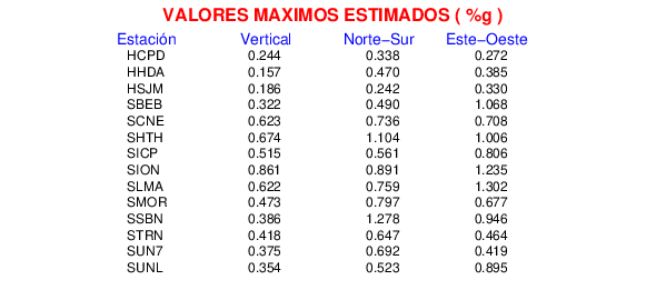 La siguiente tabla muestra los datos de aceleración máxima para cada componente en porcentaje de la aceleración de la gravedad (%g). Estos se obtienen dividiendo el valor del PGA registrado por 980 cm/s2 y multiplicándolo por 100.