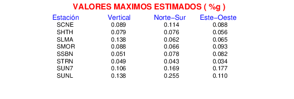 La siguiente tabla muestra los datos de aceleración máxima para cada componente en porcentaje de la aceleración de la gravedad (%g). Estos se obtienen dividiendo el valor del PGA registrado por 980 cm/s2 y multiplicándolo por 100.