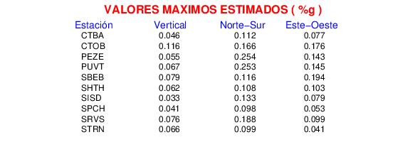 La siguiente tabla muestra los datos de aceleración máxima para cada componente en porcentaje de la aceleración de la gravedad (%g). Estos se obtienen dividiendo el valor del PGA registrado por 980 cm/s2 y multiplicándolo por 100.
