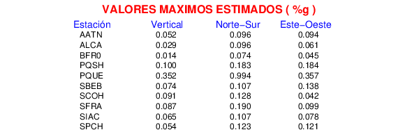 La siguiente tabla muestra los datos de aceleración máxima para cada componente en porcentaje de la aceleración de la gravedad (%g). Estos se obtienen dividiendo el valor del PGA registrado por 980 cm/s2 y multiplicándolo por 100.