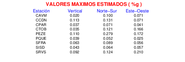 La siguiente tabla muestra los datos de aceleración máxima para cada componente en porcentaje de la aceleración de la gravedad (%g). Estos se obtienen dividiendo el valor del PGA registrado por 980 cm/s2 y multiplicándolo por 100.