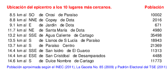 Mapa de la zona epicentral. Se muestran las poblaciones más cercanas al epicentro y fallas activas. Abajo están las distancias que hay del epicentro a cada uno de los diez sitios más cercanos y la cantidad de habitantes que poseen.