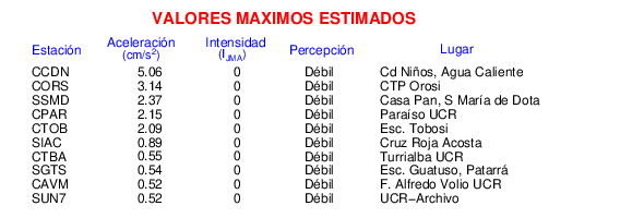 Intensidades en sitios de registro.Cada uno de los cuadrados en el mapa corresponde a la ubicación de un acelerógrafo al momento del sismo. Estos se muestran en distintos colores según la escala mostrada al pie de la figura.