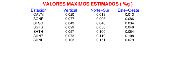 La siguiente tabla muestra los datos de aceleración máxima para cada componente en porcentaje de la aceleración de la gravedad (%g). Estos se obtienen dividiendo el valor del PGA registrado por 980 cm/s2 y multiplicándolo por 100.