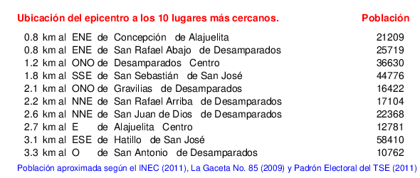 Mapa de la zona epicentral. Se muestran las poblaciones más cercanas al epicentro y fallas activas. Abajo están las distancias que hay del epicentro a cada uno de los diez sitios más cercanos y la cantidad de habitantes que poseen.