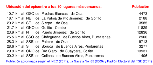 Mapa de la zona epicentral. Se muestran las poblaciones más cercanas al epicentro y fallas activas. Abajo están las distancias que hay del epicentro a cada uno de los diez sitios más cercanos y la cantidad de habitantes que poseen.