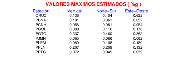 La siguiente tabla muestra los datos de aceleración máxima para cada componente en porcentaje de la aceleración de la gravedad (%g). Estos se obtienen dividiendo el valor del PGA registrado por 980 cm/s2 y multiplicándolo por 100.