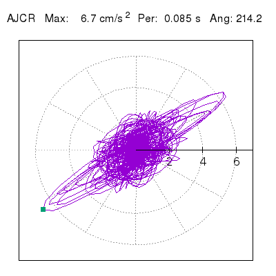 Tomando el periodo en el cual se presenta la amplitud máxima del espectro de respuesta máxima para cada estación, se representa la respuesta bidireccional en función del tiempo sobre el plano horizontal. Se identifica el punto (color verde en cada figura) del cual se desprende la orientación mostrada en el mapa de la sección superior. El valor de la acelereración máxima corresponde al punto del espectro de respuesta para el periodo indicado.