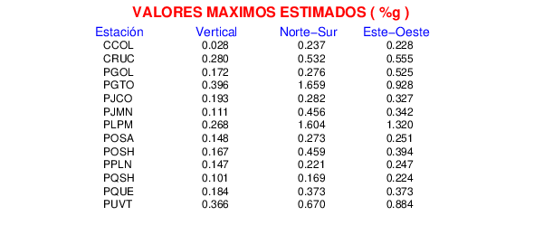 La siguiente tabla muestra los datos de aceleración máxima para cada componente en porcentaje de la aceleración de la gravedad (%g). Estos se obtienen dividiendo el valor del PGA registrado por 980 cm/s2 y multiplicándolo por 100.