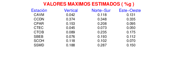 La siguiente tabla muestra los datos de aceleración máxima para cada componente en porcentaje de la aceleración de la gravedad (%g). Estos se obtienen dividiendo el valor del PGA registrado por 980 cm/s2 y multiplicándolo por 100.