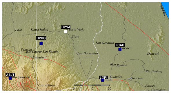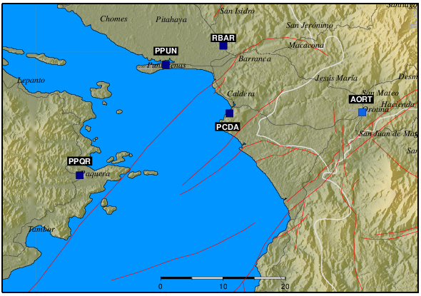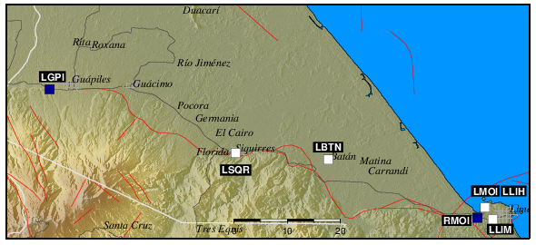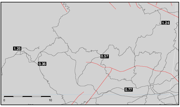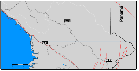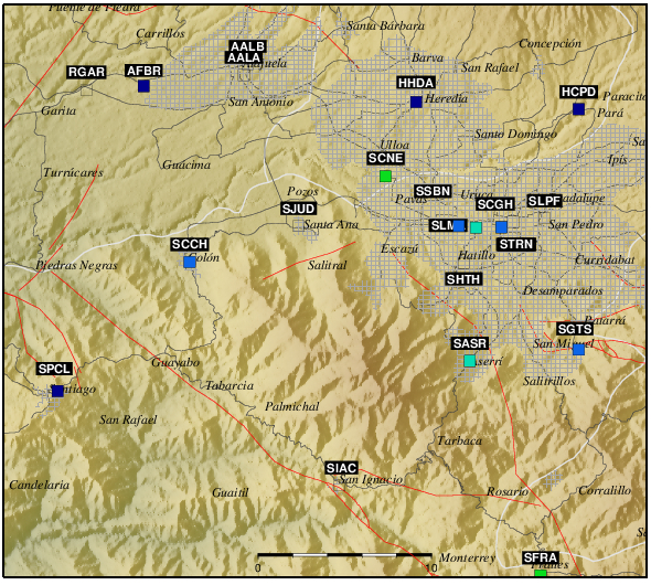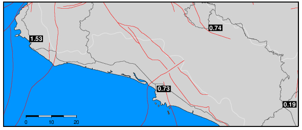 del LIS en todo el país. Los valores de aceleración máxima se muestran en porcentaje de la gravedad (%g). La aceleración de la gravedad es 980 cm/s2. Un valor de 100.00 o superior significa que muy probablemente los objetos cercanos pudieron haber sido lanzados al aire (debido a que se ha vencido el valor de "g"). Las estaciones también muestran el color de acuerdo a la escala de la intensidad de abajo. Zonas urbanas y carreteras principales se muestran en trazas grises. Las trazas rojas corresponden a fallas del Cuaternario (recientes o activas). Las trazas de color blanco son los límites de provincia |