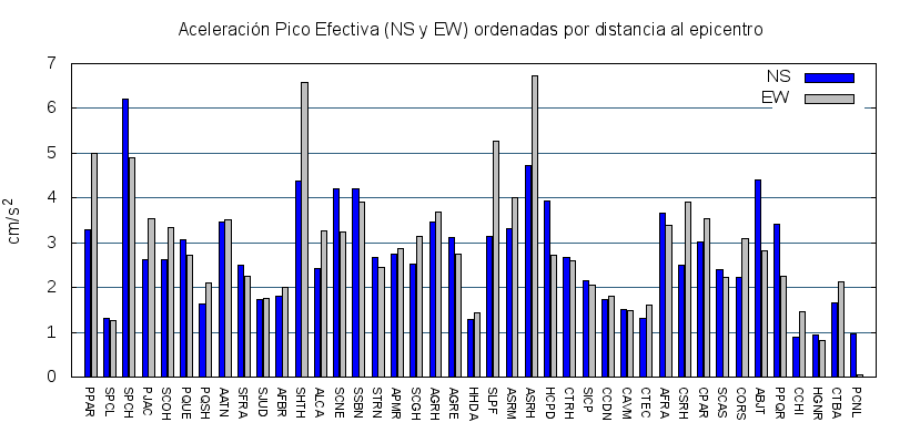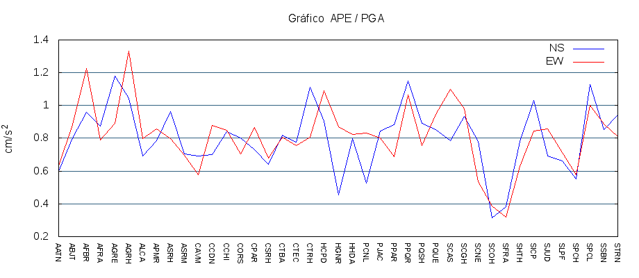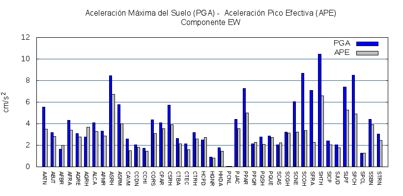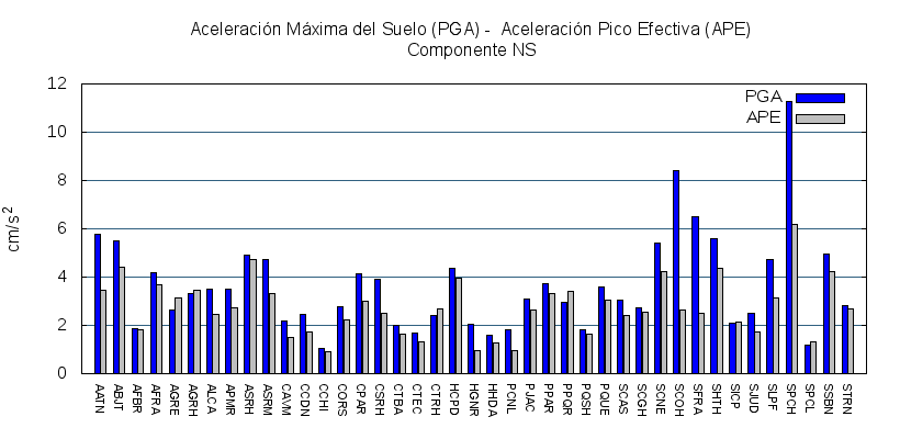 La siguiente tabla muestra los valores de aceleración efectiva para las componentes norte-sur (NS) y este-oeste (EW). También se muestra el valor del cociente entre la aceleración efectiva y la aceleración máxima (APE/PGA).