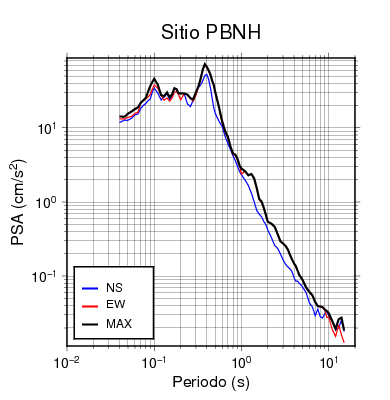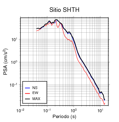 Los espectros de respuesta máxima siempre serán mayores o iguales a los espectros en las direcciones N-S y E-O. Se muestra la comparación para cada una de las estaciones en que se registró el evento.