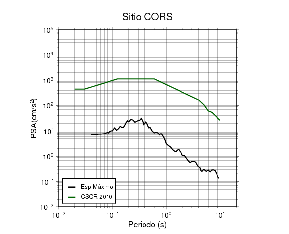 En los siguientes gráficos, la traza verde es el espectro propuesto por el CSCR-2010, la traza negra es el espectro máximo de este sismo. El valor de la amplitud está dado en pseudoaceleración en cm/s2.