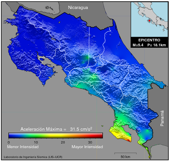 Los datos de aceleración máxima registrada se interpolan para obtener un mapa de isoaceleraciones. En el se puede ver la tendencia general de la amplificación de todo el país a partir del lugar en que el movimiento fue más intenso.