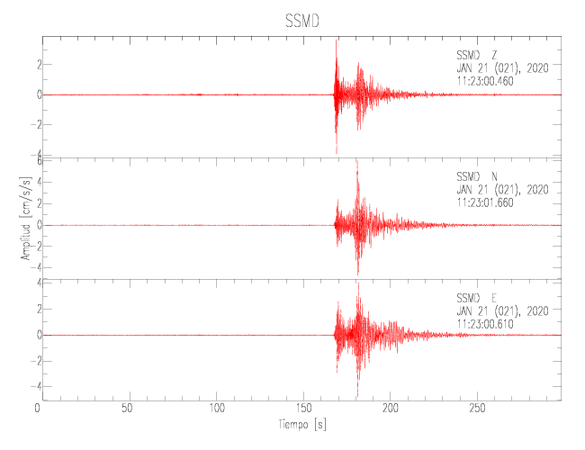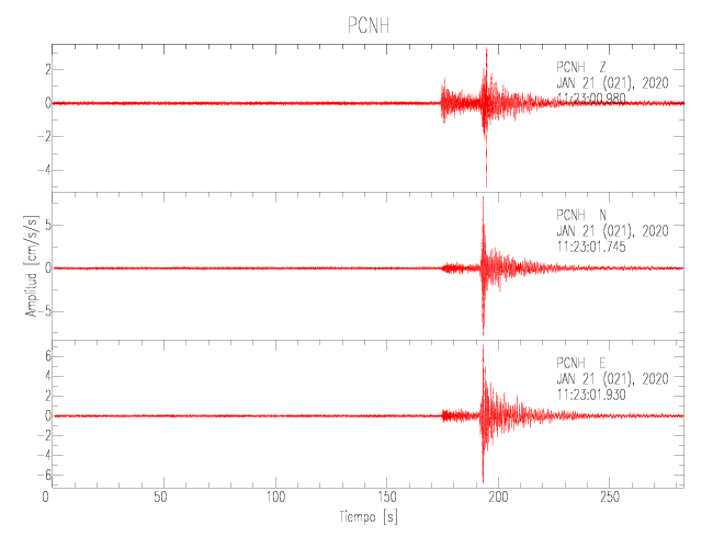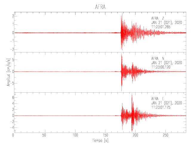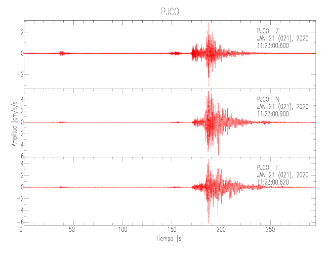 La siguiente tabla muestra los datos de aceleración máxima para cada componente en porcentaje de la aceleración de la gravedad (%g). Estos se obtienen dividiendo el valor del PGA registrado por 980 cm/s2 y multiplicándolo por 100. Las estaciones se listan en orden alfabético. Los valores de las últimas dos columnas corresponden a la componente radial y transversal.
