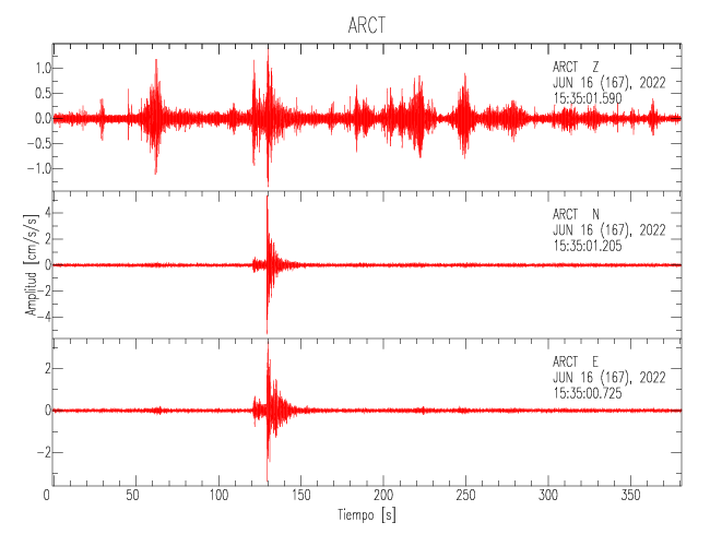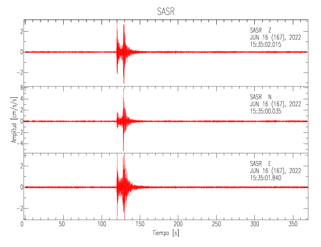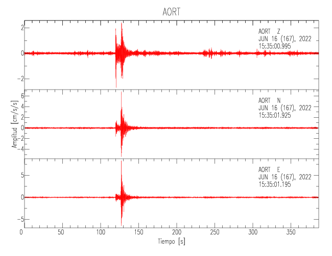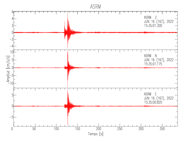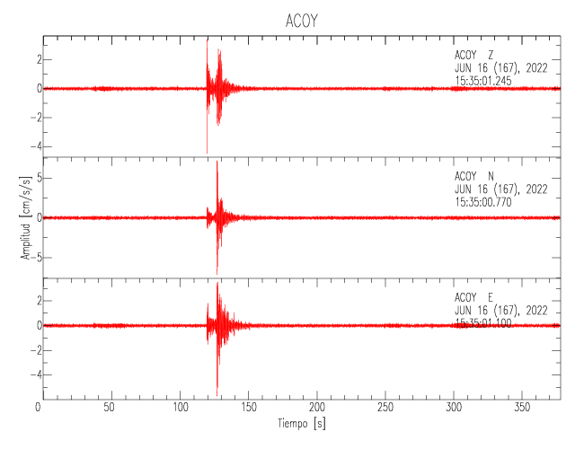 La siguiente tabla muestra los datos de aceleración máxima para cada componente en porcentaje de la aceleración de la gravedad (%g). Estos se obtienen dividiendo el valor del PGA registrado por 980 cm/s2 y multiplicándolo por 100. Los valores de las últimas dos columnas corresponden a la componente radial y transversal. Los datos se listan en orden descendente según el valor de la componente radial.