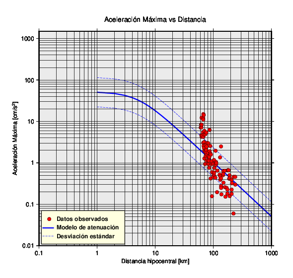 Datos del valor de la aceleración máxima (PGA por sus siglas en inglés) de cada estación (puntos rojos) en función de la distancia al hipocentro. Las trazas azules corresponden al modelo de atenuación y su respectiva desviación estándar.