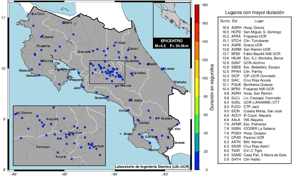 Este mapa muestra la duración en cada sitio de registro del LISUCR. Este parámetro se calculó sumando el tiempo que la amplitud del registro se mantuvo por encima de 0.5 cm/2. La tabla detalla el valor de los primeros 30 sitios con el código de la estación y el nombre del lugar donde se ubica.